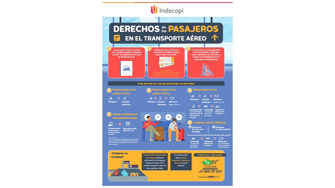 Infórmate sobre tus derechos como pasajero del transporte aéreo en el país, por ejemplo, las aerolíneas deben atender tus consultas, quejas o reclamos; y poner a tu disposición el Libro de Reclamaciones.